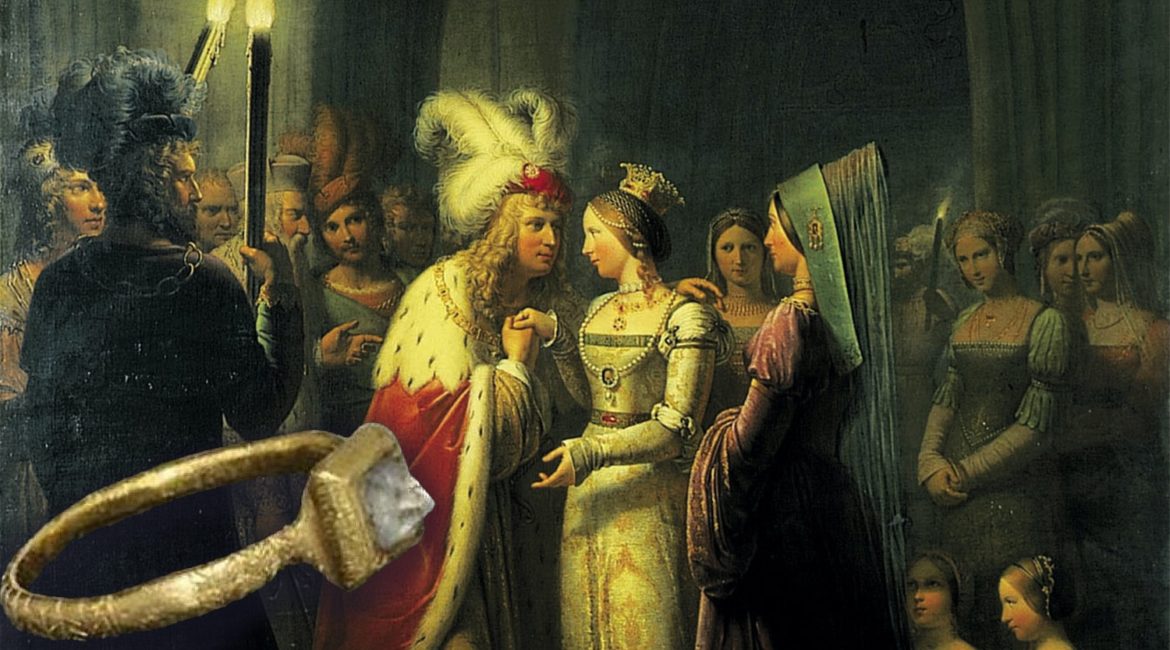 Anton Petter’s painting of Mary of Burgundy and Archduke Maximilian in Ghent, with ring seen on the index finger of her right hand. Inset is the ring that it is believed was worn, making it the world’s first known diamond engagement ring.